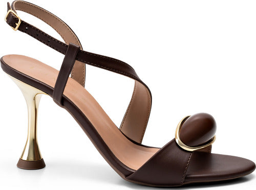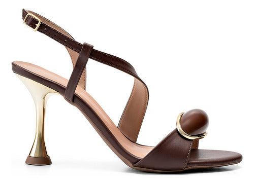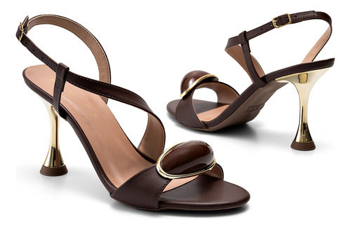 Com salto fino alto metalizado dourado, esta sandália combina sofisticação e modernidade. O cabedal elegante é realçado por um enfeite na mesma tonalidade, com detalhe dourado que adiciona um toque refinado ao look.