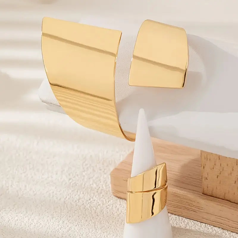 2 Peças Conjunto de Joias Feminino com Pulseira Geométrica e Anel, Estilo Moderno e Ousado para Uso Diário ou Festas, Presente em Combo