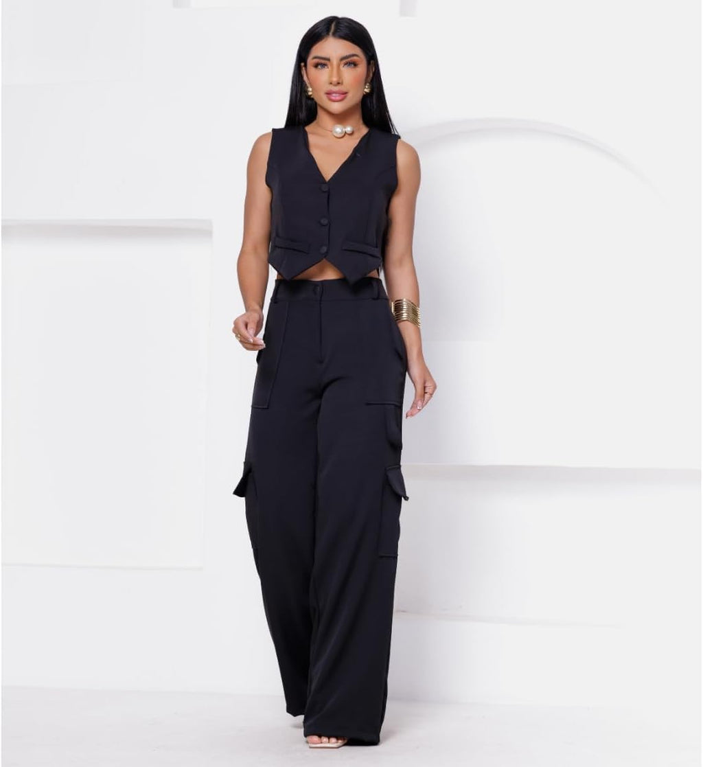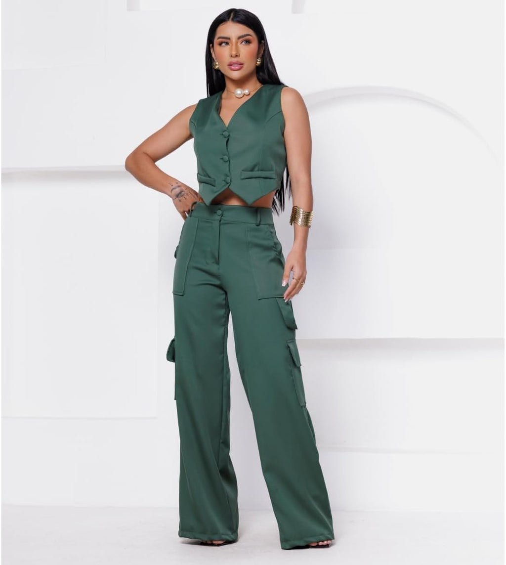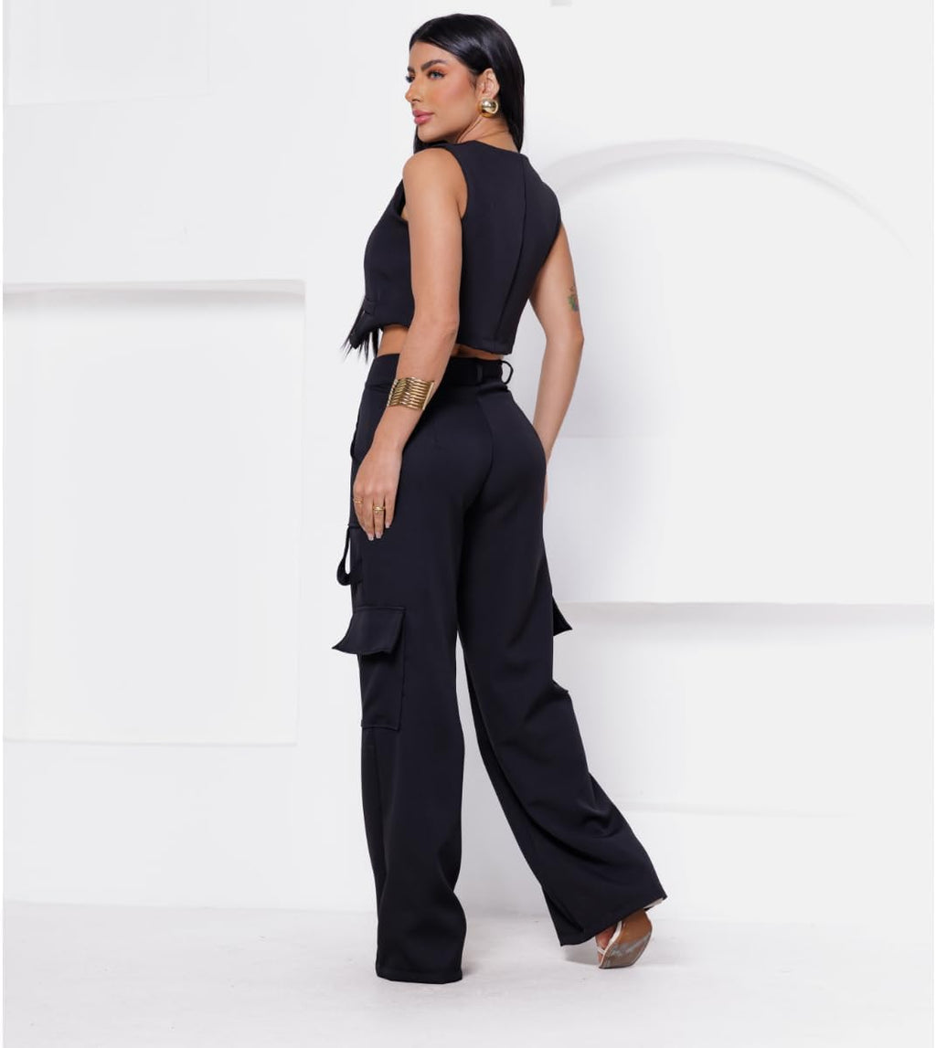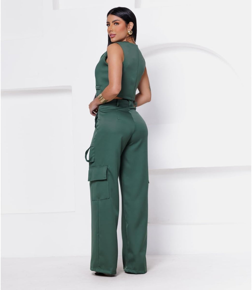 - Calça Cargo com bolsos frontais e laterais Colete Curto Com Bolso Fake