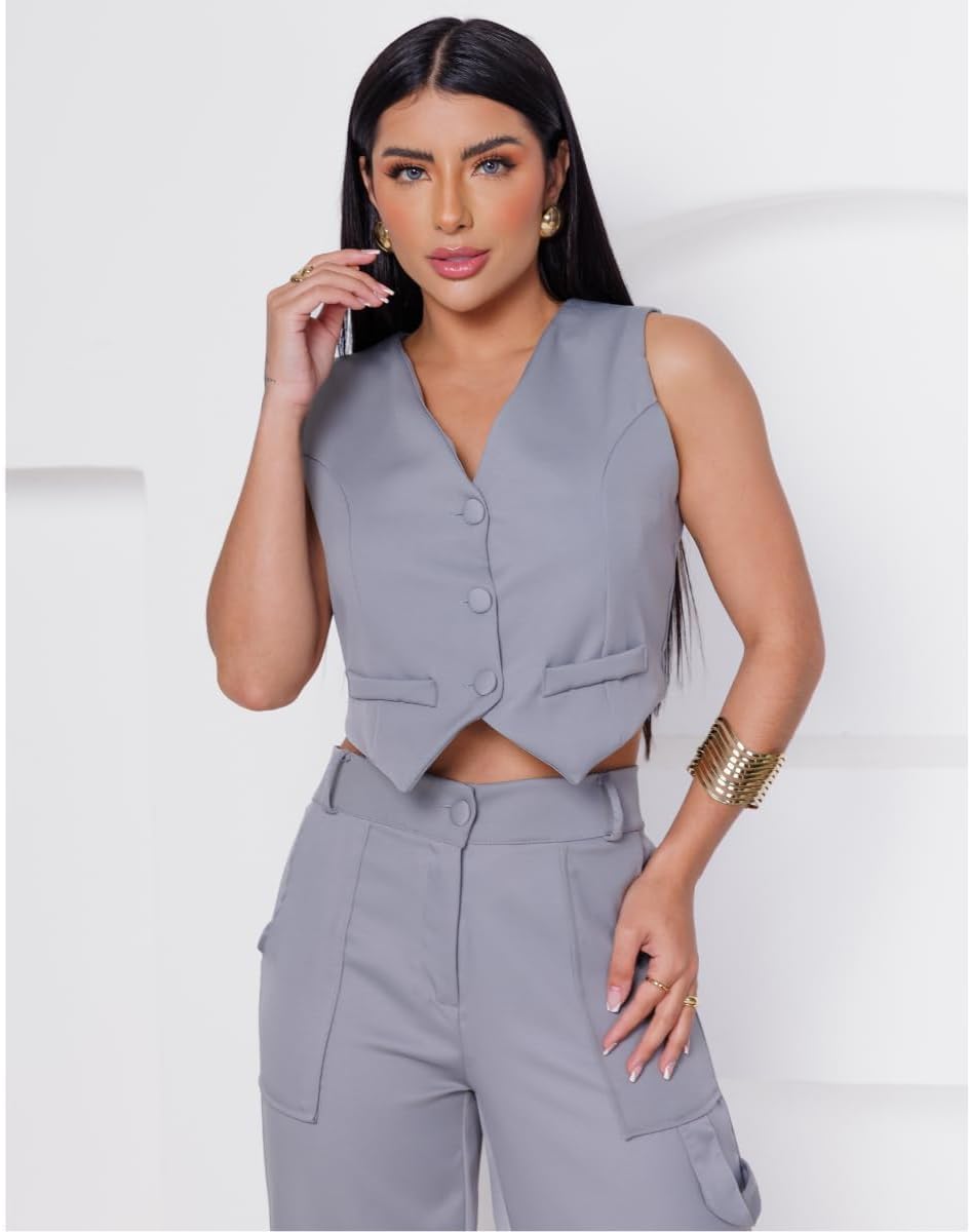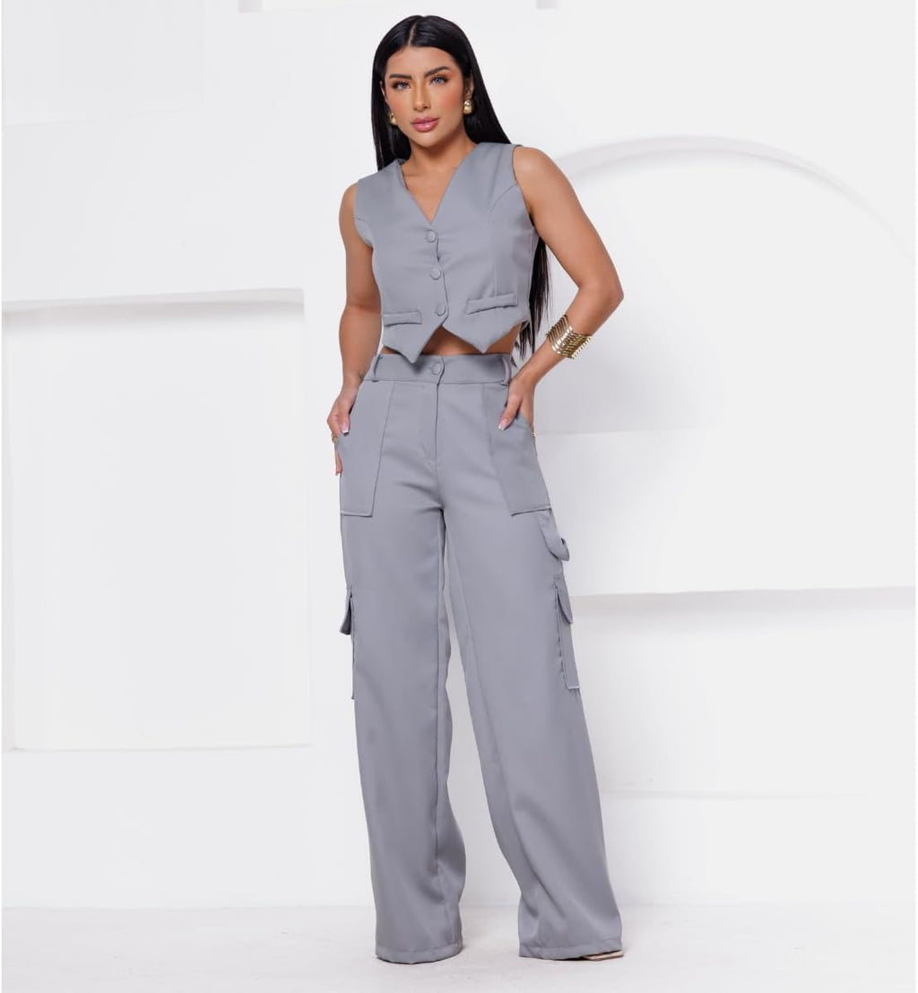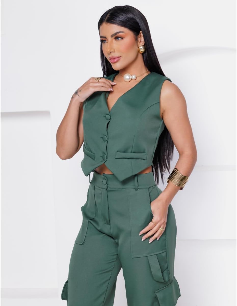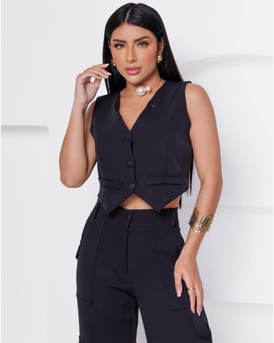 Conjunto Calça e Colete, feito para a mulher contemporânea que não abre mão do estilo, este conjunto é perfeito para qualquer ocasião, seja no escritório ou em um passeio descontraído pela cidade. Combinando um colete e uma calça de cintura alta, este conjunto é perfeito para diversas ocasiões, desde eventos formais até passeios casuais. Produto: Conjunto Feminino Social Alfaiataria de Calça e Colete Tecido: Alfaiataria Composição: Poliéster Bolsos: Sim (laterais calça) Tecido: Não amarrota Tecido: Não encolhe Tecido: sem elasticidade (não estica) Cintura Alta: Sim Tabela de Medidas: CALÇA: P / 38 = Cintura: 78cm | Quadril: 108cm | Comprimento: 107cm M / 40 = Cintura: 82cm | Quadril: 112cm | Comprimento: 109cm G / 42 = Cintura: 86cm | Quadril: 116cm | Comprimento: 111cm GG / 44 = Cintura: 90cm | Quadril: 120cm | Comprimento: 114cm G1 / 46 = Cintura: 92cm | Quadril: 124cm | Comprimento: 116cm COLETE: P / 38 = Busto: 90cm | Comprimento: 40cm M / 40 = Busto: 92cm | Comprimento: 41cm G / 42 = Busto: 96cm | Comprimento: 42cm GG / 44 = Busto: 102cm | Comprimento: 43cm G1 / 46 = Busto: 104cm | Comprimento: 44cm IMPORTANTE - Verifique o guia de medidas e escolha o tamanho que mais se aproxime das medidas do seu corpo. - Tipo de lavagem suave e a mão sem uso de alvejantes, não recomendamos lavagem a seco e uso de secadoras. O colete adiciona um toque de refinamento, enquanto a calça cargo traz uma vibe urbana e prática. Juntos, eles criam uma harmonia de moda que é irresistível. Fabricado com tecidos de alta qualidade e detalhes cuidadosamente trabalhados, este conjunto proporciona conforto sem comprometer o estilo. A linha de botões forrados e delicados na parte frontal adiciona um toque de charme e elegância ao visual. A calça de cintura alta é um dos destaques deste conjunto. Feita para realçar a silhueta feminina, ela valoriza a cintura e alonga as pernas, proporcionando uma aparência estilizada e harmoniosa. Os bolsos laterais funcionais adicionam praticidade e modernidade à peça. Este conjunto é um investimento essencial para o guarda-roupa de qualquer mulher que valoriza a versatilidade sem abrir mão do bom gosto. Adicione um toque de elegância e sofisticação ao seu visual com nosso Conjunto de Alfaiataria hoje mesmo.