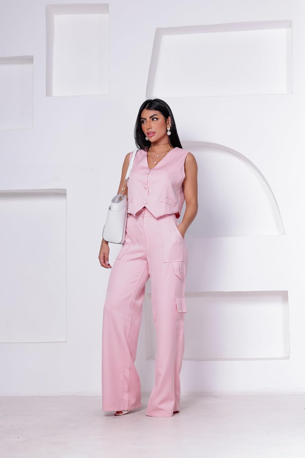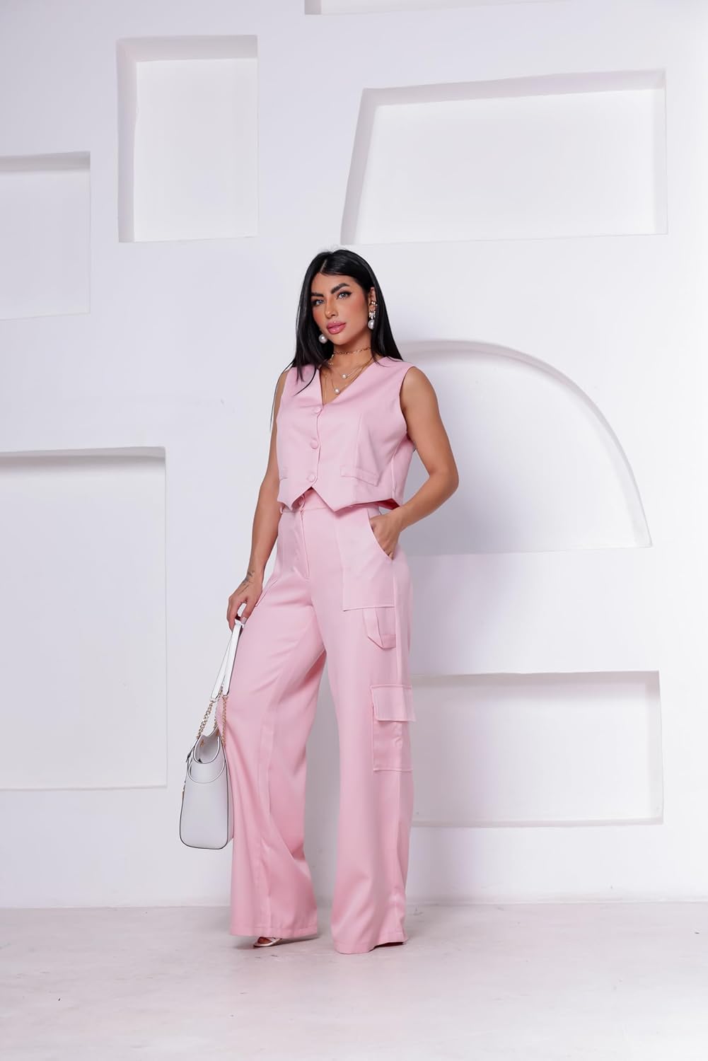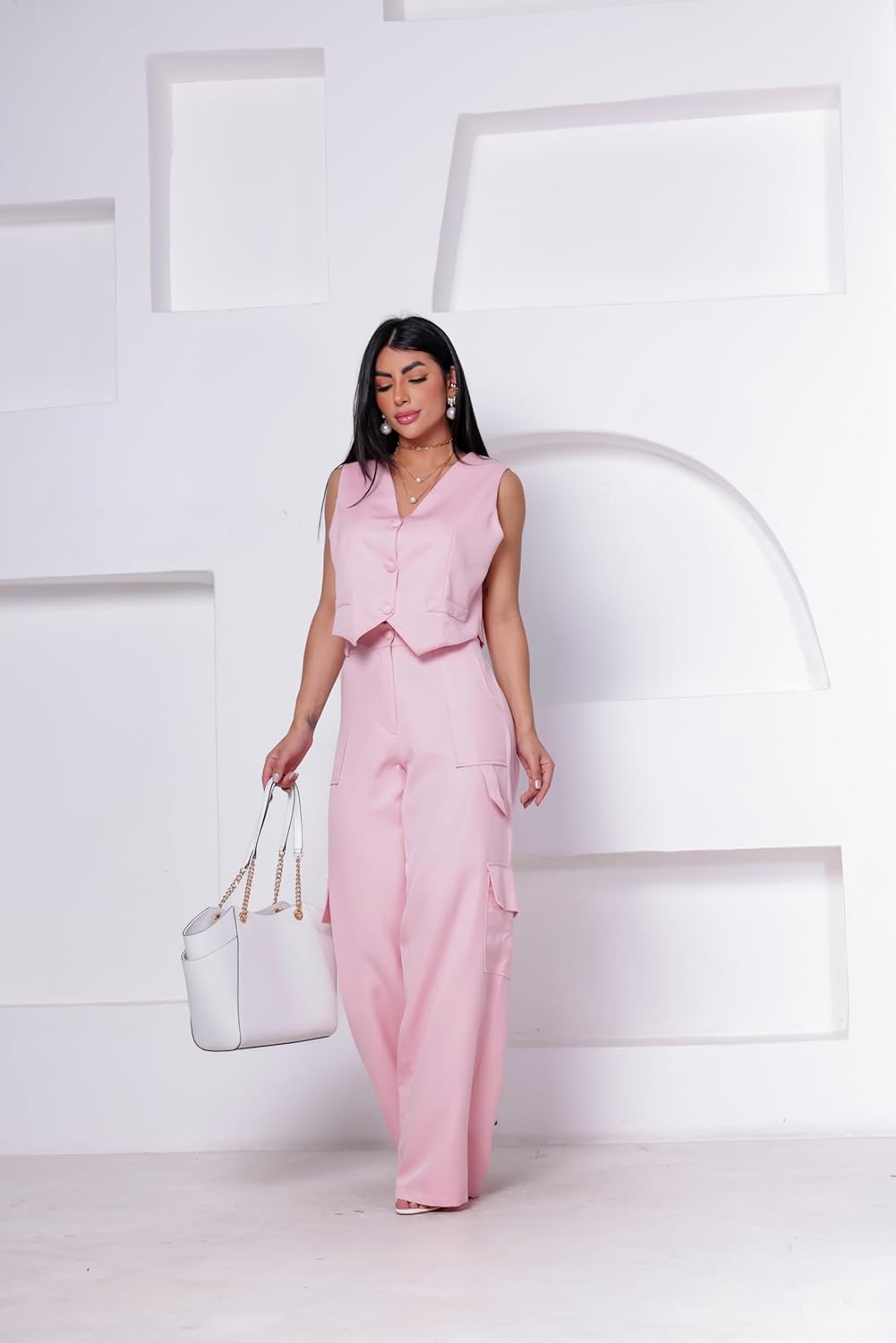 Conjunto Calça e Colete, feito para a mulher contemporânea que não abre mão do estilo, este conjunto é perfeito para qualquer ocasião, seja no escritório ou em um passeio descontraído pela cidade. Combinando um colete e uma calça de cintura alta, este conjunto é perfeito para diversas ocasiões, desde eventos formais até passeios casuais. Produto: Conjunto Feminino Social Alfaiataria de Calça e Colete Tecido: Alfaiataria Composição: Poliéster Bolsos: Sim (laterais calça) Tecido: Não amarrota Tecido: Não encolhe Tecido: sem elasticidade (não estica) Cintura Alta: Sim Tabela de Medidas: CALÇA: P / 38 = Cintura: 78cm | Quadril: 108cm | Comprimento: 107cm M / 40 = Cintura: 82cm | Quadril: 112cm | Comprimento: 109cm G / 42 = Cintura: 86cm | Quadril: 116cm | Comprimento: 111cm GG / 44 = Cintura: 90cm | Quadril: 120cm | Comprimento: 114cm G1 / 46 = Cintura: 92cm | Quadril: 124cm | Comprimento: 116cm COLETE: P / 38 = Busto: 90cm | Comprimento: 40cm M / 40 = Busto: 92cm | Comprimento: 41cm G / 42 = Busto: 96cm | Comprimento: 42cm GG / 44 = Busto: 102cm | Comprimento: 43cm G1 / 46 = Busto: 104cm | Comprimento: 44cm IMPORTANTE - Verifique o guia de medidas e escolha o tamanho que mais se aproxime das medidas do seu corpo. - Tipo de lavagem suave e a mão sem uso de alvejantes, não recomendamos lavagem a seco e uso de secadoras. O colete adiciona um toque de refinamento, enquanto a calça cargo traz uma vibe urbana e prática. Juntos, eles criam uma harmonia de moda que é irresistível. Fabricado com tecidos de alta qualidade e detalhes cuidadosamente trabalhados, este conjunto proporciona conforto sem comprometer o estilo. A linha de botões forrados e delicados na parte frontal adiciona um toque de charme e elegância ao visual. A calça de cintura alta é um dos destaques deste conjunto. Feita para realçar a silhueta feminina, ela valoriza a cintura e alonga as pernas, proporcionando uma aparência estilizada e harmoniosa. Os bolsos laterais funcionais adicionam praticidade e modernidade à peça. Este conjunto é um investimento essencial para o guarda-roupa de qualquer mulher que valoriza a versatilidade sem abrir mão do bom gosto. Adicione um toque de elegância e sofisticação ao seu visual com nosso Conjunto de Alfaiataria hoje mesmo.
