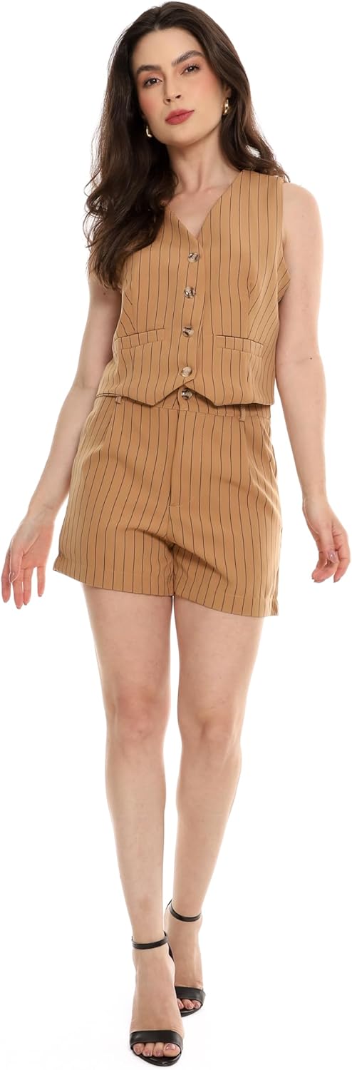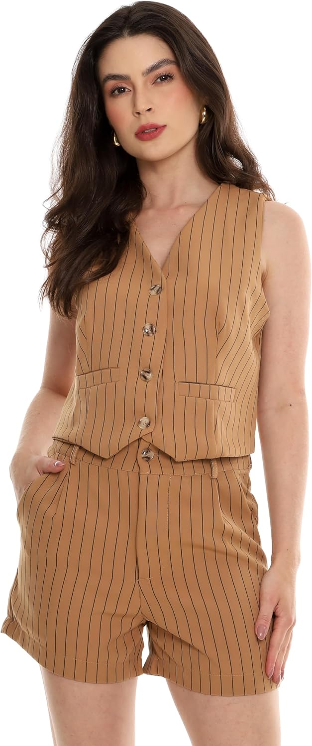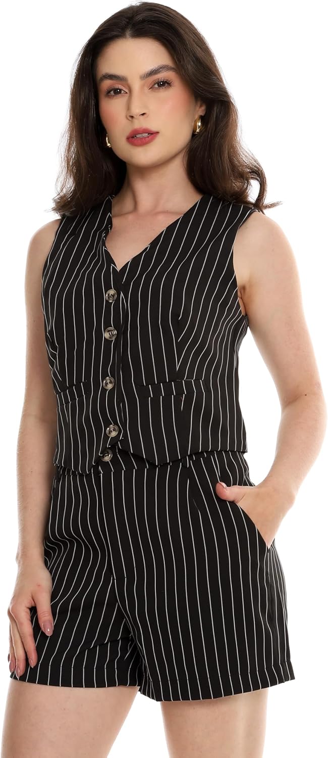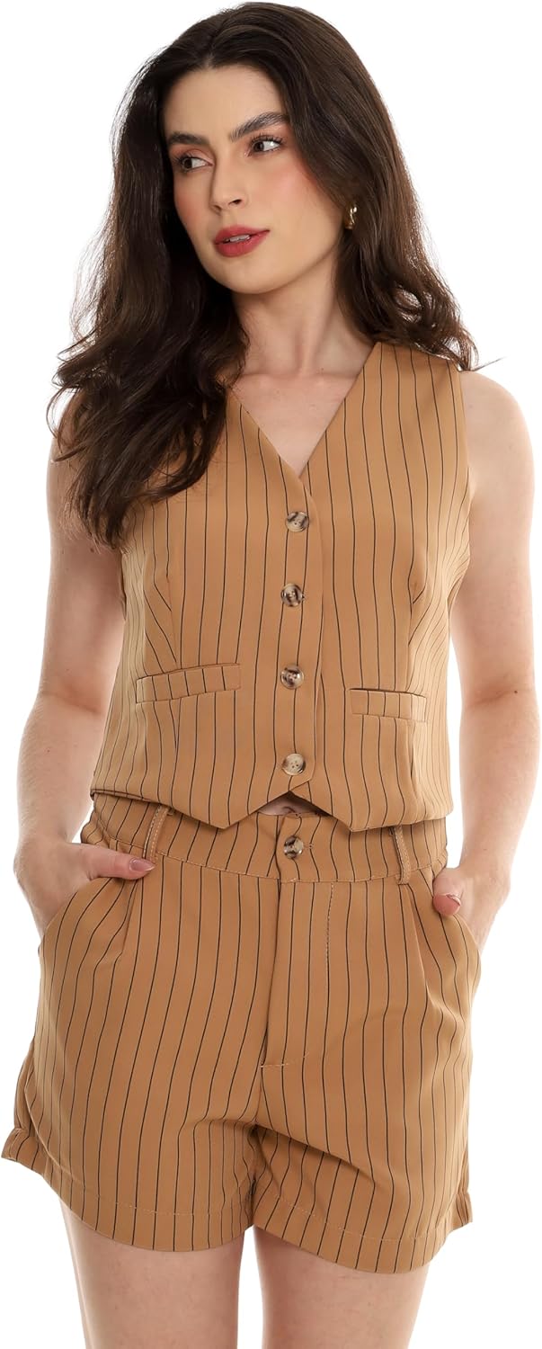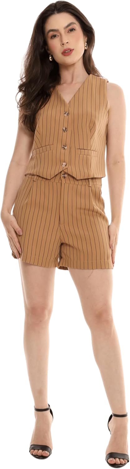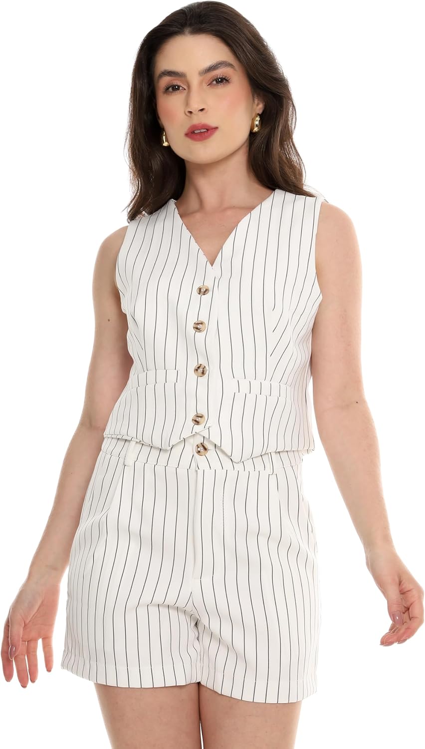 - CONJUNTO ELEGANTE: Conjunto feminino de alfaiataria listrado composto por colete e short, perfeito para looks sociais e casuais
