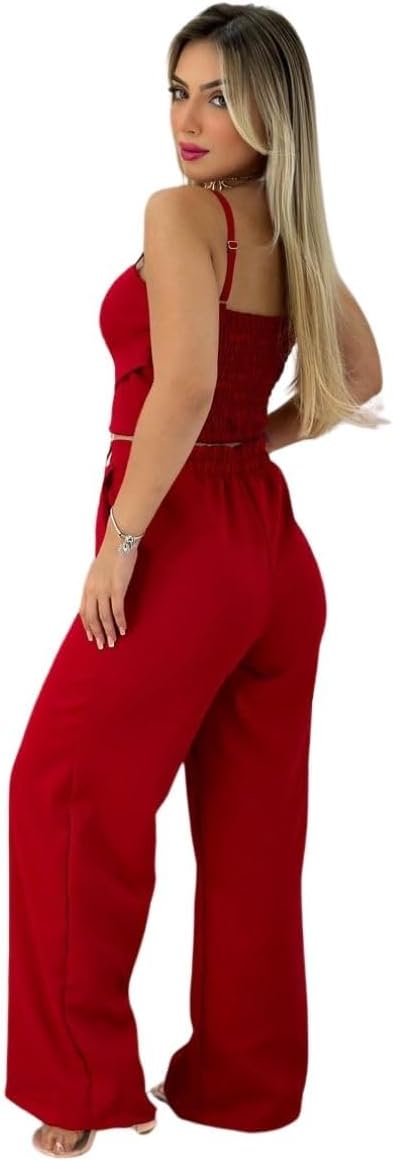 • Modelagem atual: O corte cropped da calça e o design do top valorizam as curvas femininas.