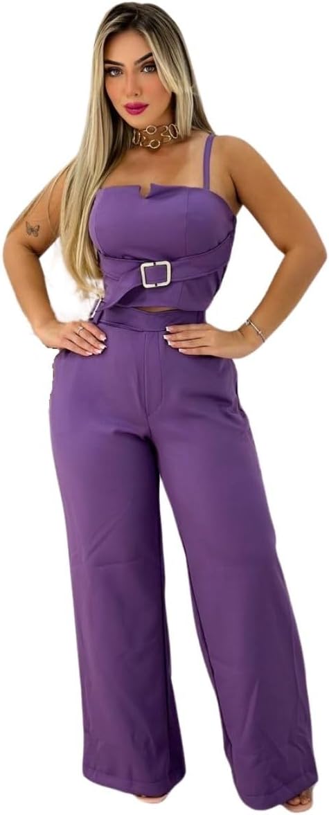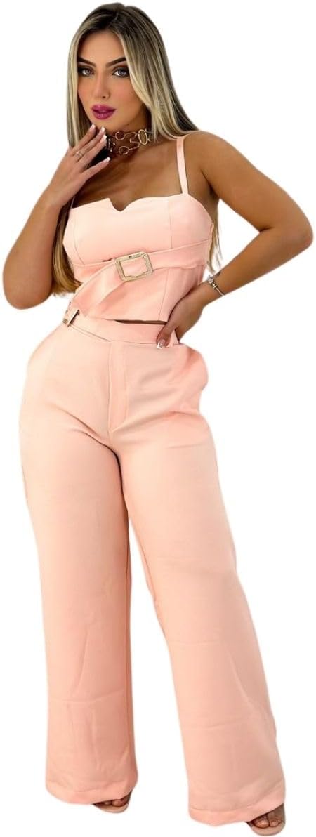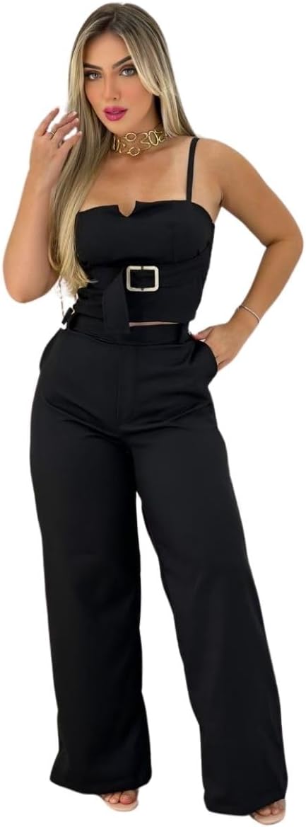 • Conjunto elegante: Esse conjunto feminino combina calça cropped e top com fivela, perfeito para looks modernos e estilosos.