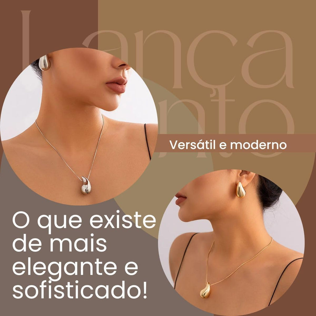 - O pingente e o brinco em formato de gota deixam o estilo minimalista e moderno, com um brilho marcante que reflete o seu gosto refinado.