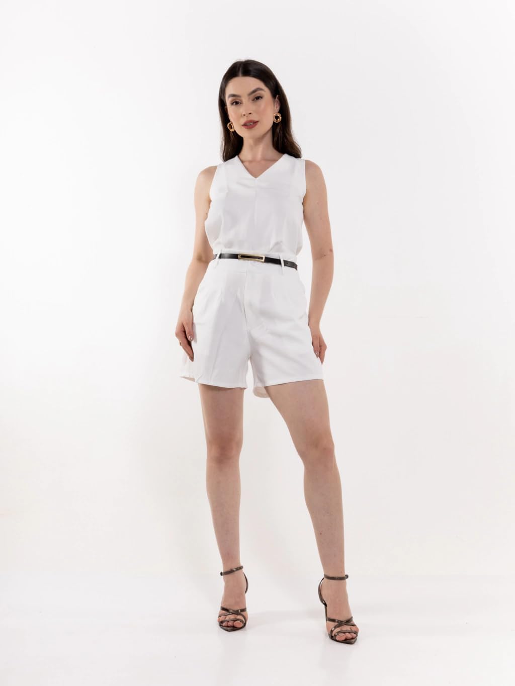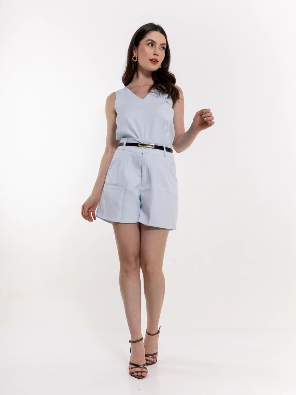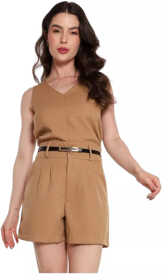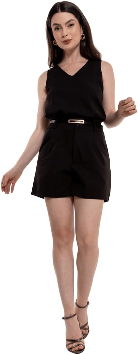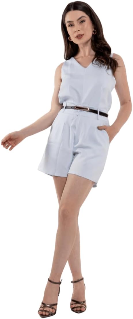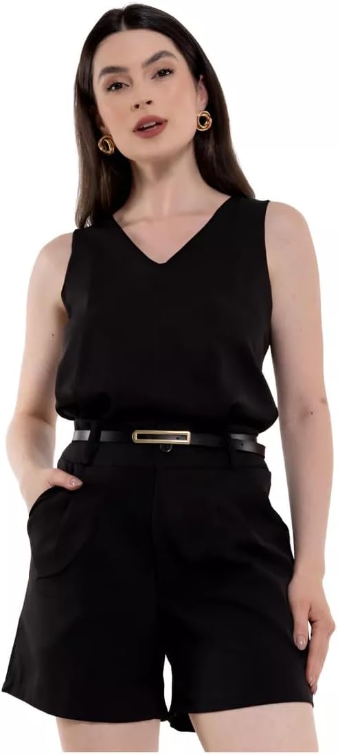 • DETALHES REFINADOS: Shorts com pregas frontais, cinto fino com fivela dourada e decote V na regata para um visual moderno e sofisticado