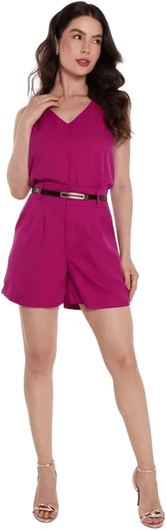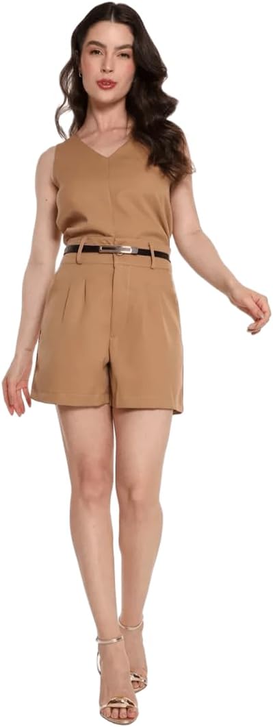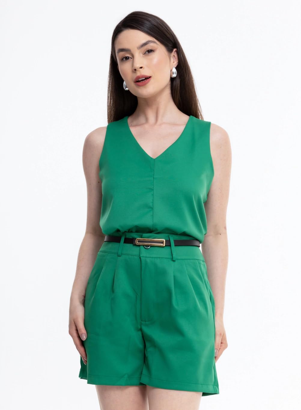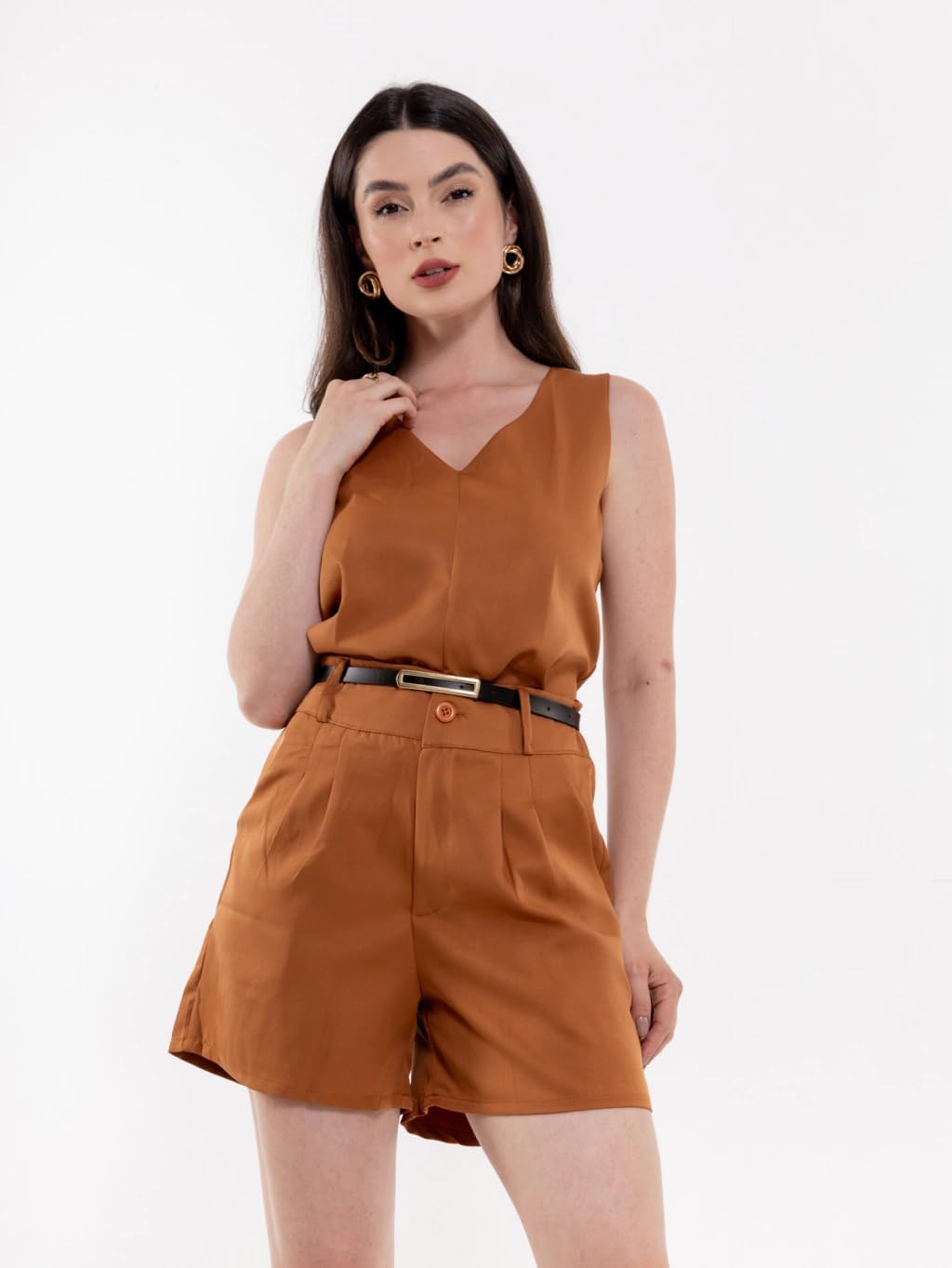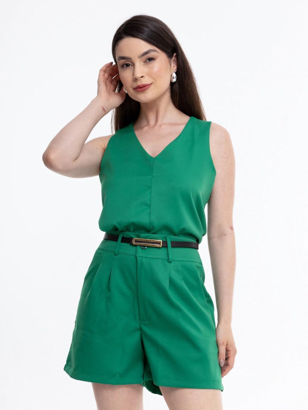 • DETALHES REFINADOS: Shorts com pregas frontais, cinto fino com fivela dourada e decote V na regata para um visual moderno e sofisticado