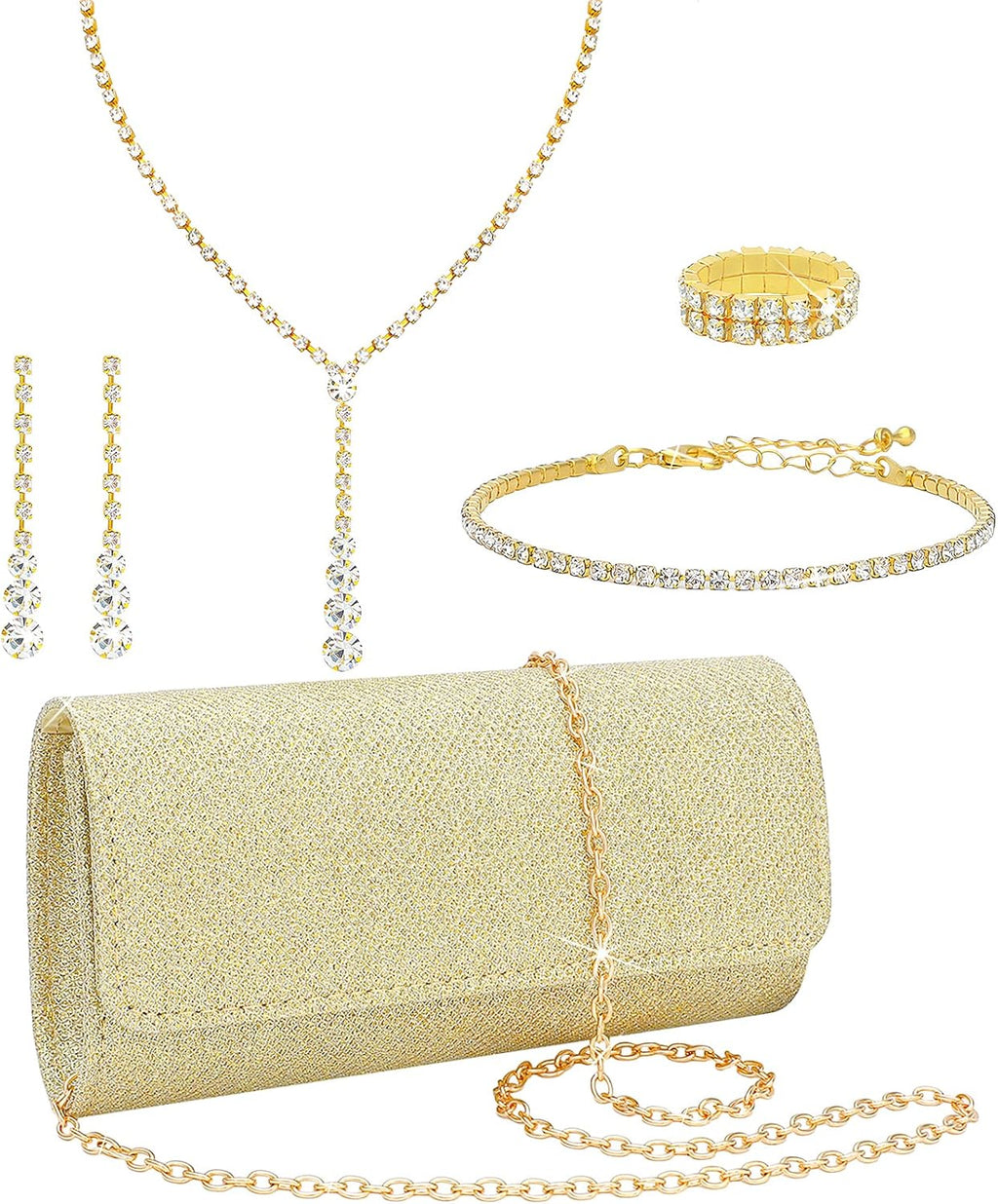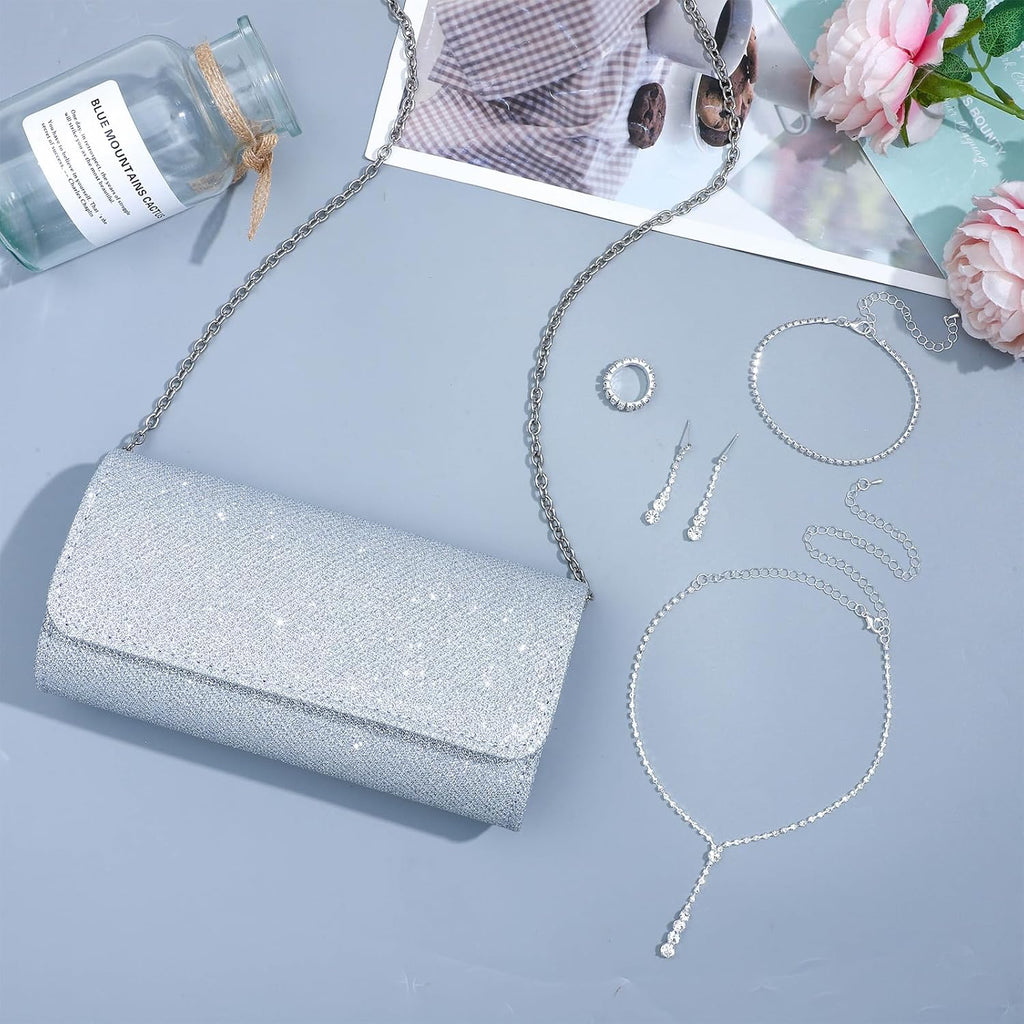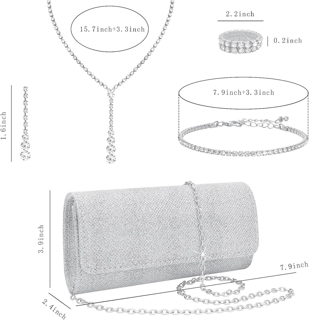 • O que você recebe: você receberá 5 peças de joias de prata de estilos diferentes com 1 peça de bolsa clutch brilhante, 1 colar, 1 par de brincos, 1 peça de anel e 1 pulseira, adicionando um belo conjunto abrangente à sua coleção de joias. Cada um tem um estilo diferente, nosso conjunto de bijuterias satisfaz as mulheres para combinar com vestidos de noite diversificados ou outras roupas formais